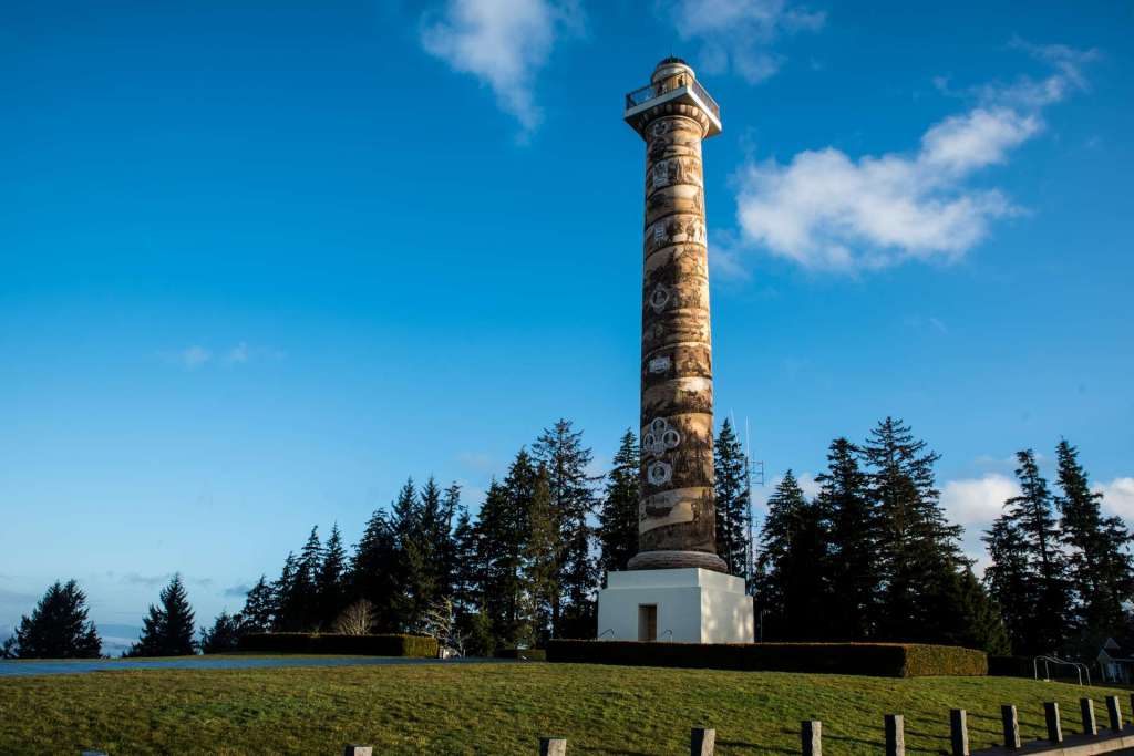 The 125-foot tall Astoria Column was built and dedicated in 1926. The spiraling history of the exploration and settlement of the Astoria area moves upward from the indigenous Clatsop and Chinook cultures through significant events, from the arrival of Captain Gray in the Columbia Rediva in 1792 through the arrival of the Astoria and Columbia River Railroad in 1898. Only the first circle, identified as “Before the white people arrive” and resting on the base, depicts the many centuries of indigenous experience. Each of the 26 spirals above that genesis is about the “white people” in the area or about interactions between whites and indigenous peoples. Within the tower, a 164-step spiral steel staircase leads to an observation platform. Fortunately, there are three landings that allow for panting and puffing. When I made the claim, I stopped on each landing. A girl of perhaps 10 years, ran up the stairs past me. Then ran down. Then ran up again before I made it to the top. That made me aware that I’m not as young as I used to be.
