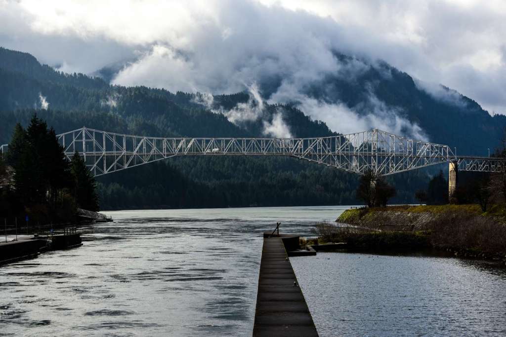 Rain-heavy clouds hang over Bridge of the Gods, between Cascade Locks, Oregon, and a location a short distance west of Stevenson, Washington. Oregon is on the left in this west looking shot. The concrete walkway in the middle is part of the original Cascade Locks. In February, clouds hang low over the Columbia River Gorge.