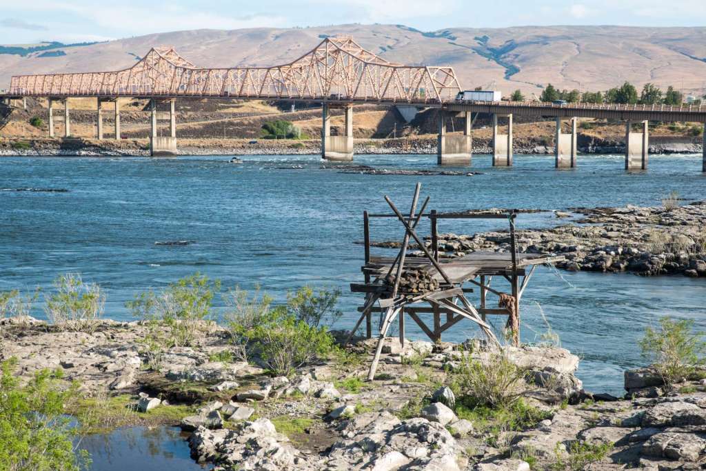 Another traditional Native American fishing site in Washington state is bridged by the massive concrete Monroe Street Bridge in Spokane. The Spokane Falls, now the site of the Lower Falls Dam just upriver from the Monroe Street Bridge, welcomed Spokane and Nez Perce tribal members, as well as tribes from across the Columbia Plateau, to catch and trade for giant Chinook salmon.