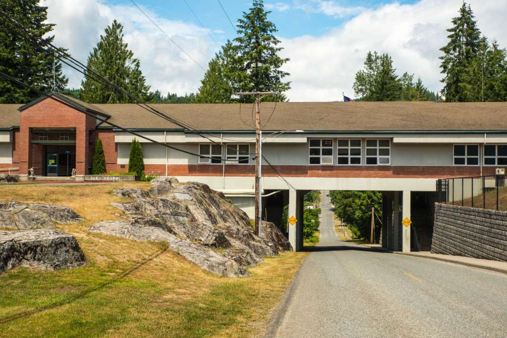 Concrete, Washington, on SR 20, 29 miles east of Burlington and I-5, had a population of 729 in 2017, big enough to have its own high school. The high school is noteworthy here because the school itself is a bridge. The school spans South Superior Avenue and provides shelter from rain and snow for students disembarking from school buses. Stairways on both sides of the road provide dry access to the school.
