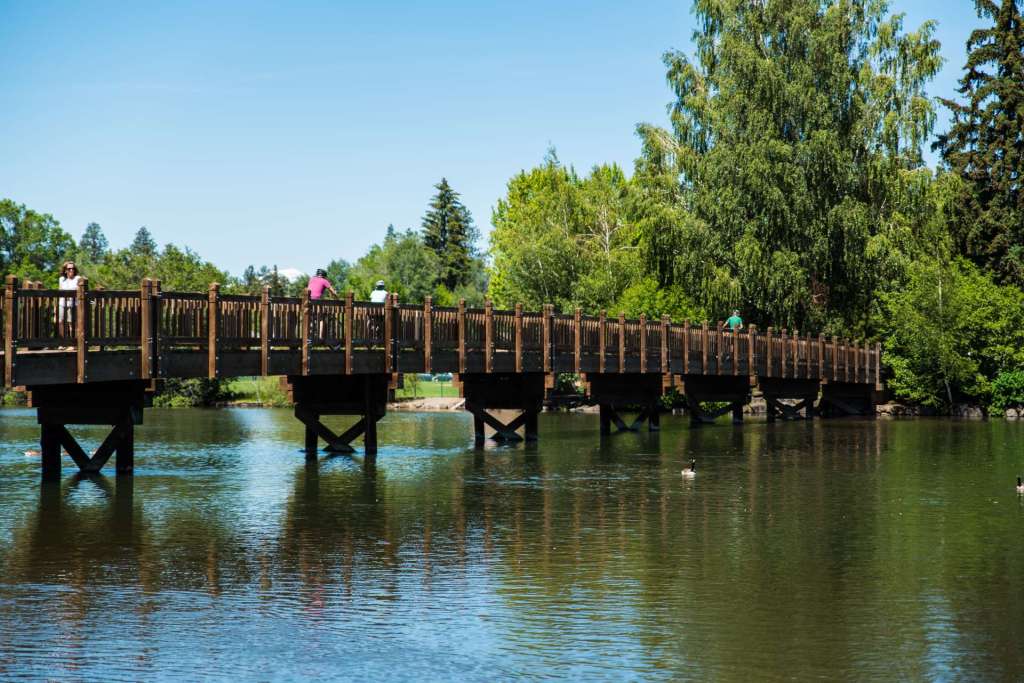 We start with a wooden trestle foot bridge that crosses the Deschutes River in Bend, in central Oregon. Bend is an outdoor city, offering cross-country and down hill skiing in the winter, hiking and cycling, like the folks in the image below, spring through fall, hunting and fishing year round. The 2017 population of Bend was 94,520.
