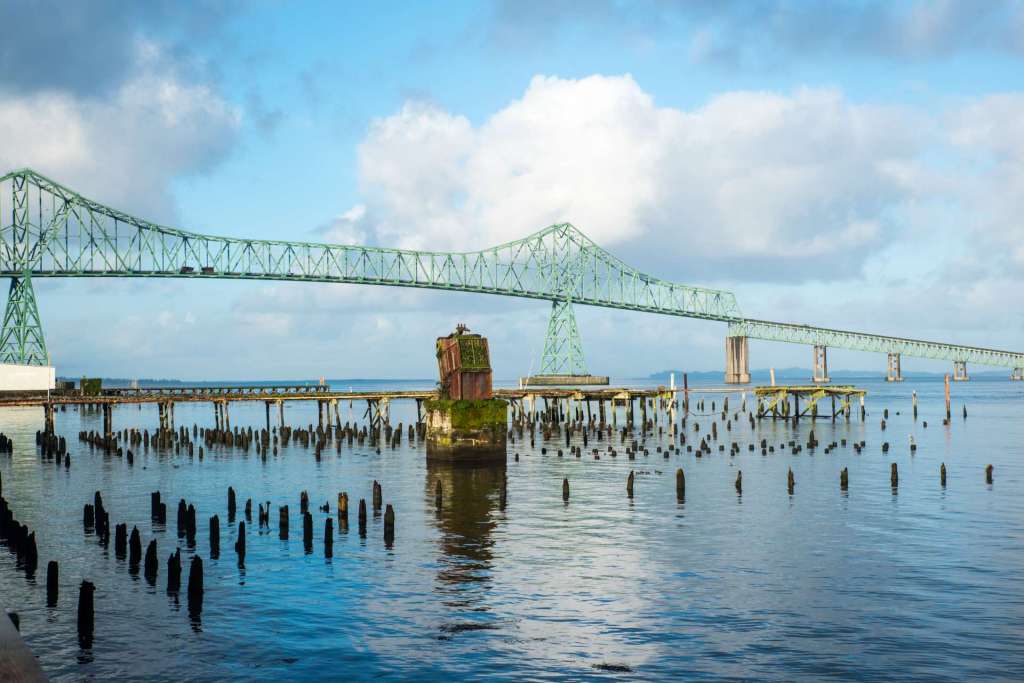 The highest span of Astoria-Megler Bridge flies 196 feet above the River at high tide. Weathered stubs of pilings and chunks of concrete and steel from long gone fish canneries speckle reflections of clouds on a calm morning in January as the sun climbs above Astoria.