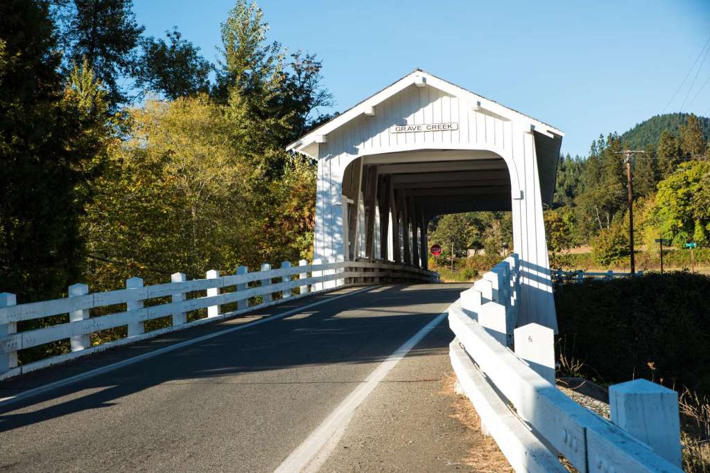 The Grave Creek Bridge in southern Oregon is one of 54 covered bridges in Oregon. Oregon has more covered bridges than any other state. Spanning Grave Creek, the bridge is a short distance east of I-5 on Sunny Valley Loop Road, 16 miles north of Grants Pass, Oregon. Built in 1920, the county took ownership of the bridge when I-5 was constructed. It was closed in 1990, and reopened in 2001 after repairs. Grave Creek Bridge has six Gothic windows on each side, concrete abutments, and a shake roof.