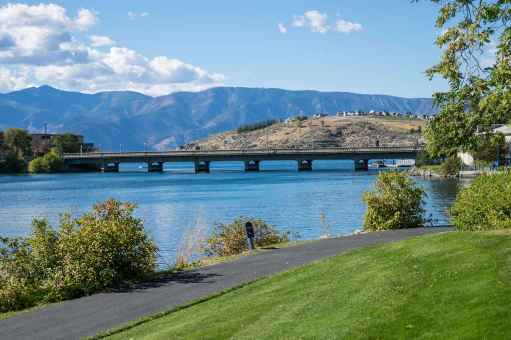 Lake Chelan Dam sits on a bluff above the Columbia River and impounds the 50 mile long Lake Chelan. The City of Chelan is on both sides of the Chelan River at the foot of the lake and two bridges cross the lake to join the city. The West Woodin Avenue Bridge, shown here, is farther from the dam. Chelan Lake widens above the Woodin Avenue Bridge as it begins its long stretch into the North Cascades mountains. The Rivewalk trail in the foreground follows the shoreline on both sides of the lake and crosses the lake on sidewalks across the Woodin Avenue Bridge and the Webster Avenue Bridge, behind the camera.
