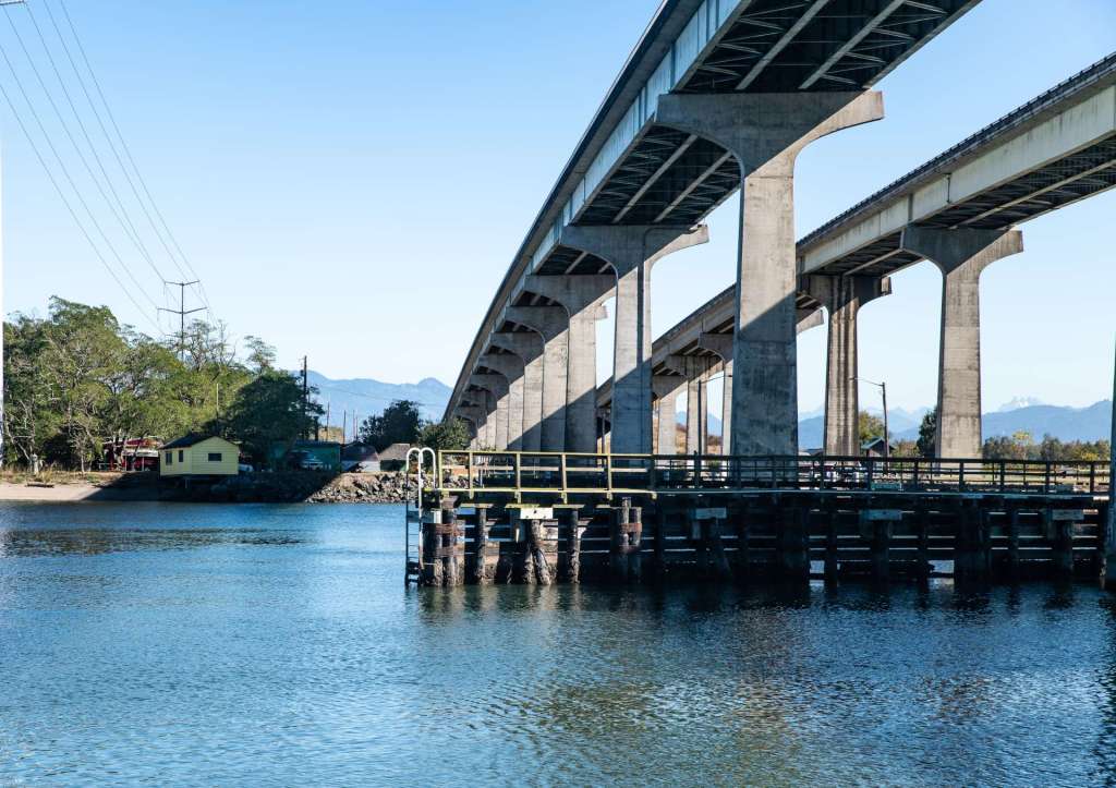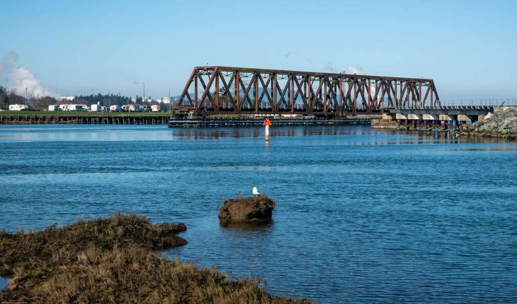 Anacortes, WA – Swinomish Channel BNSF Bridge. Driving down the hill and under the Twin Bridges, a traveler can park near the casino and walk along the Swinomish Channel that separates Fidalgo Island and the Swinomish Reservation from the Skagit County mainland. Boats should exercise caution when navigating the Swinomish Channel because of tidal flows and hidden obstructions. One of the periodic obstructions is the BNSF swing bridge that connects Fidalgo Island with the mainland.