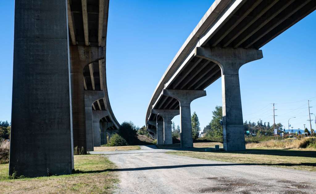 The Twin Bridges make a sweeping curve on the Fidalgo Island side of the channel. State Route 20 crosses the Swinomish Channel on high soaring concrete bridges. Eastbound lanes are on the left and westbound lanes are on the right in the image below.