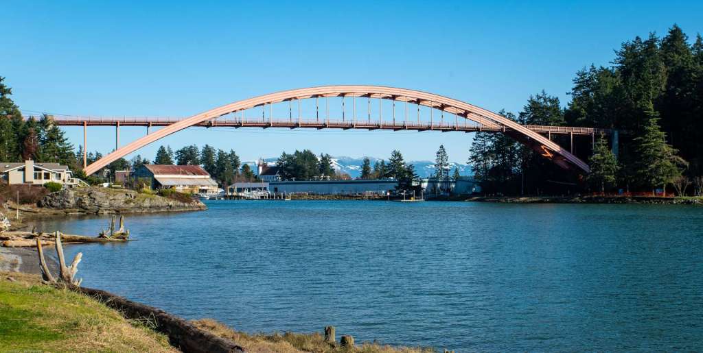 A day in mid-February, 2020, was sunny and bright in western Washington, a welcome respite from the winter rain. The Rainbow Bridge, arching over Swinomish Channel from La Conner, on the right in the image above, at the western edge of Skagit County, to the Swinomish Tribal Indian Community on Fidalgo Island, on the left. The steel deck arch bridge is 75 feet above the water in the channel.