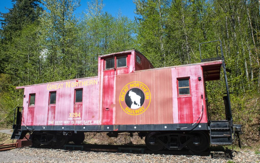 US 2 passes beyond the small railroad town of Skykomish and climbs along the Skykomish River through firs and cedars. Deception Falls is on the right, though it’s tucked back among the trees and hills on the right and the driver must watch for it. Beyond the Falls, the Stevens Pass Highway passes the Iron Goat Interpretive Site. A faded caboose is parked at the site, a few miles west of Stevens Pass. The Iron Goat on the side is the logo of the Great Northern railway. Great Northern Railway laid the tracks over Stevens Pass that connected Seattle and St Paul. The midwestern United States were connected across the northern tier of states, Minnesota, the Dakotas, Montana, Idaho, Washington, all the way to Seattle on Puget Sound. Great Northern Railway merged with three other railroads to form Burlington Northern Railroad in 1970. Burlington Northern merged with the Atchison, Topeka, and Santa Fe Railway in 1996 to form the Burlington Northern and Santa Fe Railway, known as the BNSF. BNSF now owns and uses the route surveyed, engineered, and constructed by Great Northern. The interpretive site includes several fascinating posters with maps and history of the pass and railway.