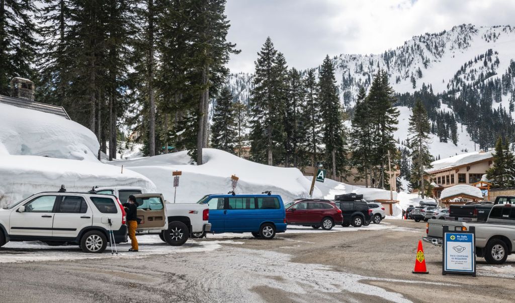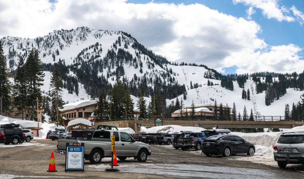 Snow plows carved the parking lots at the Stevens Pass Ski Resort, but the snow was still deep where the plows didn’t reach. In April, masks were still required everywhere, especially in the ski lodge at Stevens Pass. The blue and white sign, lower left, says, “Nose and mouth must be covered.”