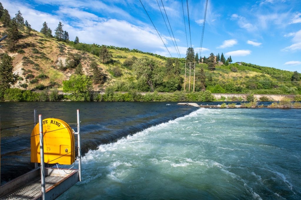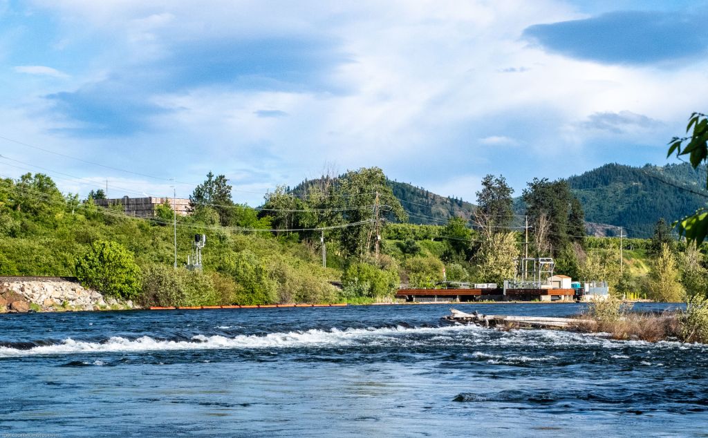The Wenatchee River rolls over the low Dryden Diversion Dam in spring. The Dam is between Peshastin and Dryden and serves to divert river water to the Highline Canal, a gravity flow irrigation canal that serves the orchards along the Wenatchee from Dryden to Wenatchee and across the Columbia River to East Wenatchee. The dam and canal were completed in 1903.
