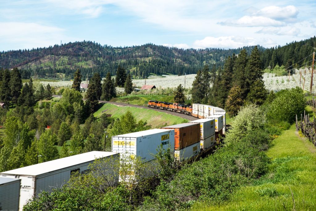 Five locomotive engines haul freight through the multi-hued, fir and apple clad hills between Peshastin and Leavenworth on the eastern slopes of the Cascades. The freight trains need the extra engines to climb up and over Stevens Pass in the North Cascades. This cargo is probably bound for the Seattle seaport and far destinations over the sea. White apple blossoms decorate hillsides, center and upper right.
