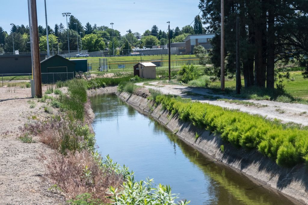 The historic Wenatchee Reclamation Ditch draws water from the Wenatchee River at Dryden and carries it through Wenatchee, across the Columbia River by pipe, through East Wenatchee, for 34 miles, all the way to Rock Island. The ditch irrigates orchards, farms, and family gardens along its route. Here, it passes Eastmont High School, the playing field is top center, in East Wenatchee.enatchee.