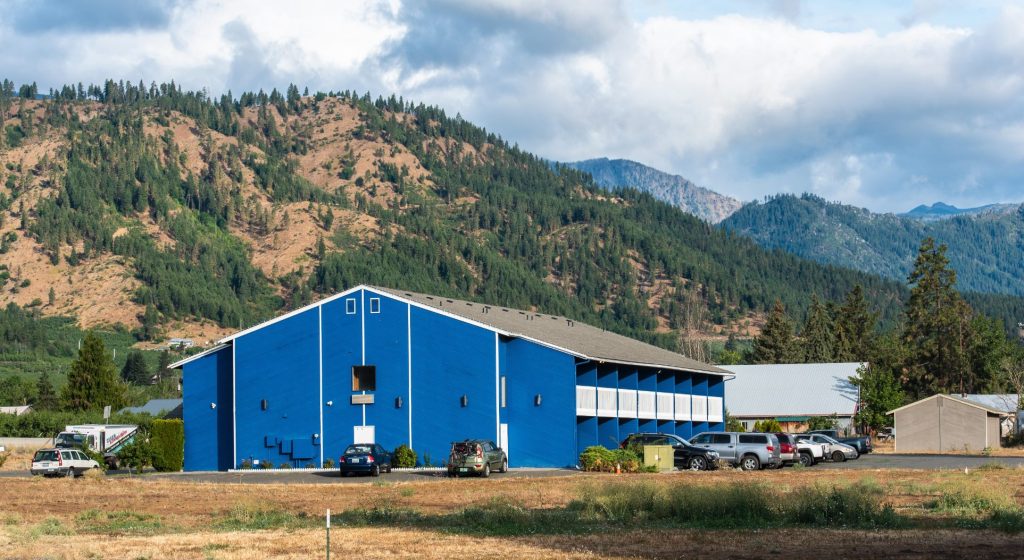 A massive, concrete warehouse in Peshastin stores tree fruit, apples and pears, and packs and ships the fruit across the country and around the world. A huge cooling system on the roof chills the fruit for storage. Fruit warehouses in Peshastin and Dryden are vital to the economy of the Wenatchee River valley, employing more workers than any other enterprise along the river. Fruit is transported by large trucks and on nearby BNSF freight cars.