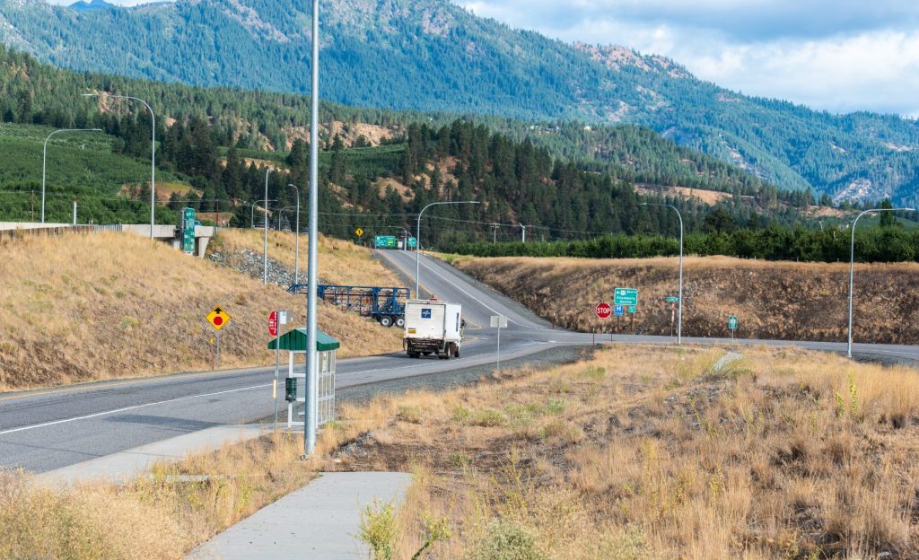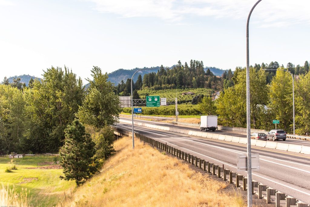 A semi parks in a truck parking space on the shoulder of US 2/97 just east of the Big Y intersection near Peshastin. Leavenworth is four miles ahead on US 2, Wenatchee is 19 miles behind the camera on US 2/97. The exit ramp for US 97 is in the center of the image. The American Harvest billboard, right of center, advertises a cannabis shop in Peshastin.